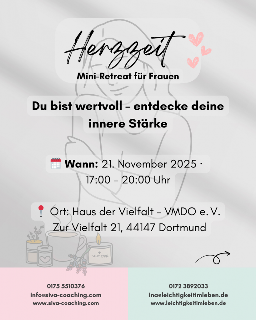 Die Termine sind einzeln buchbar – je nachdem, was dich anspricht. Die jeweiligen Themen werden rechtzeitig hier auf der Website und bei Instagram (@leichtigkeit.im.leben und @from_siva_with_love) bekannt gegeben.